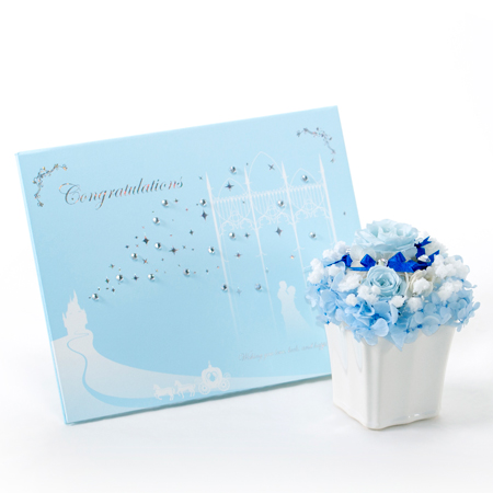 ブルーのフラワーをメインにアレンジしたシンデレラブルー。花の華やかさを魅せるドームフラワーのアレンジとなっています。和装挙式でも問題ありませんが、オシャレな雰囲気の式場におすすめのプリザーブドフラワー電報です。電報屋エクスメールで注文できる人気商品となっています。他の方の電報とかぶりたくないというニーズを持つ方におすすめです。